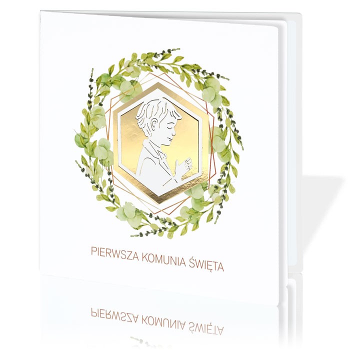 Całość zdobi kolorowy motyw roślinny, który został uszlachetniony lakierem dla subtelnego połysku. W centralnej części zaproszenia umieszczono precyzyjnie wyciętą laserowo złoto-białą aplikację przedstawiającą chłopca w stroju komunijnym, nadającą projektowi uroczysty charakter.