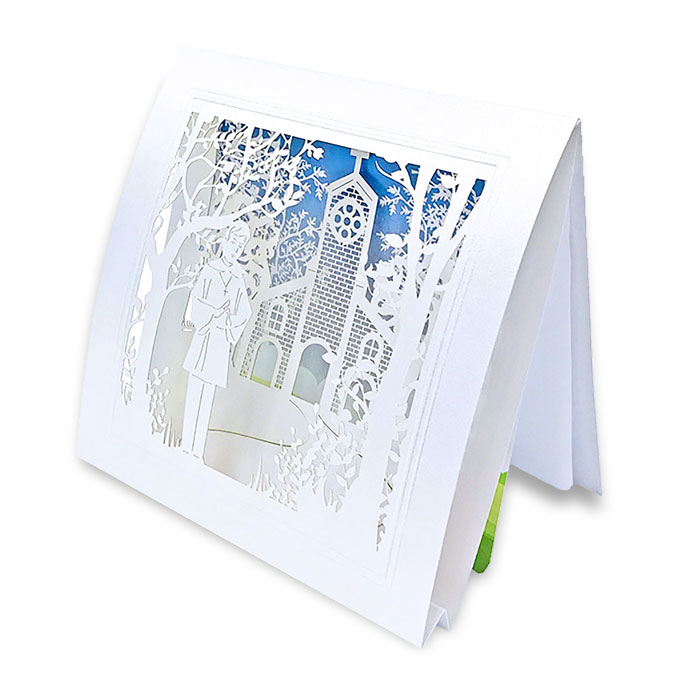 Ekskluzywne zaproszenie na Pierwszą Komunię Świętą, wykonane z wysokiej jakości metalizowanego papieru w kolorze białym. Zaproszenie wyróżnia się ażurowym cięciem laserowym, tworzącym efekt trójwymiarowej kompozycji, przedstawiającej chłopca w stroju komunijnym na tle kościoła.