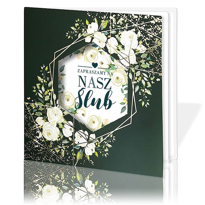 Nowoczesne i efektowne zaproszenie ślubne w odcieniach ciemnej zieleni, ozdobione geometrycznym wycięciem oraz florystycznym motywem w stylu glamour. Okładka wykonana z matowego papieru pokrytego delikatną w dotyku, satynową folią, uszlachetniona złoceniem, które podkreśla detale kompozycji. Przez centralny otwór widoczny jest nadrukowany napis "Zapraszamy na Nasz Ślub", umieszczony na pierwszej stronie wkładki.