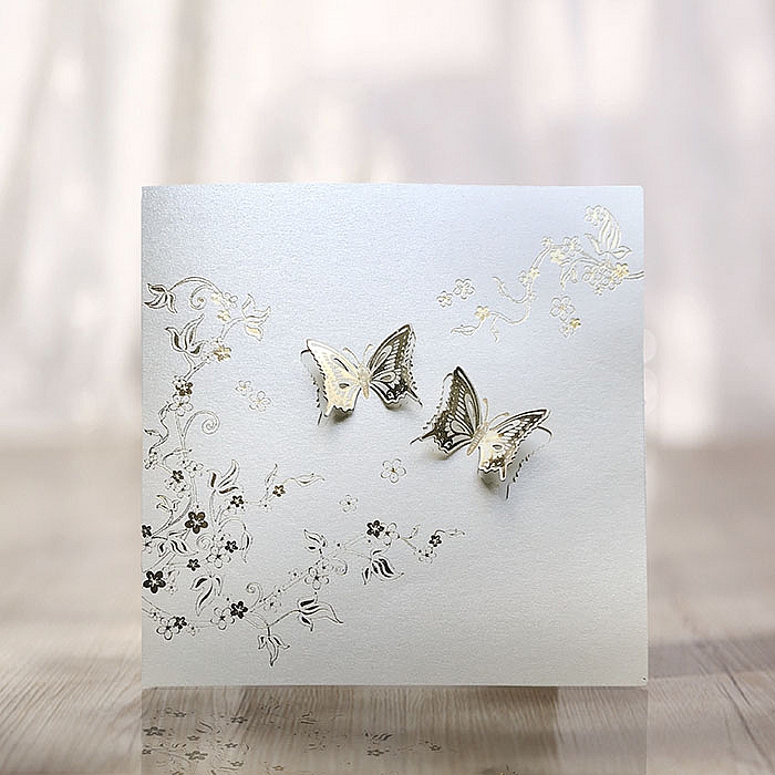 Subtelne i eleganckie zaproszenie ślubne, które urzeka szlachetną formą i zmysłowym połyskiem. Wykonane z wysokiej jakości metalizowanego papieru w odcieniu jasnego ecru, z delikatnie lśniącą powierzchnią. Okładkę zdobią złocone ornamenty roślinne oraz dwa motyle, których skrzydła delikatnie unoszą się nad powierzchnią, tworząc trójwymiarowy efekt.