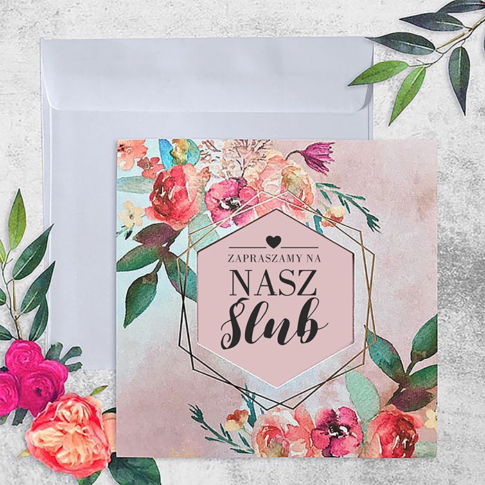 Subtelne i zarazem wyraziste zaproszenie ślubne, które zachwyca połączeniem pastelowego tła z artystycznym nadrukiem kwiatów w stylu akwarelowym. Okładka wykonana z matowego papieru, uszlachetniona satynową folią, dzięki której kartka zyskuje jedwabistą fakturę. Efekt kropli wody uzyskano poprzez lakier wybiórczy, a nowoczesny geometryczny wzór podkreślono hotstampingiem w kolorze miedzianym. Centralny otwór w okładce ukazuje nadrukowany napis: "Zapraszamy na Nasz Ślub", znajdujący się na pierwszej stronie wkładki.