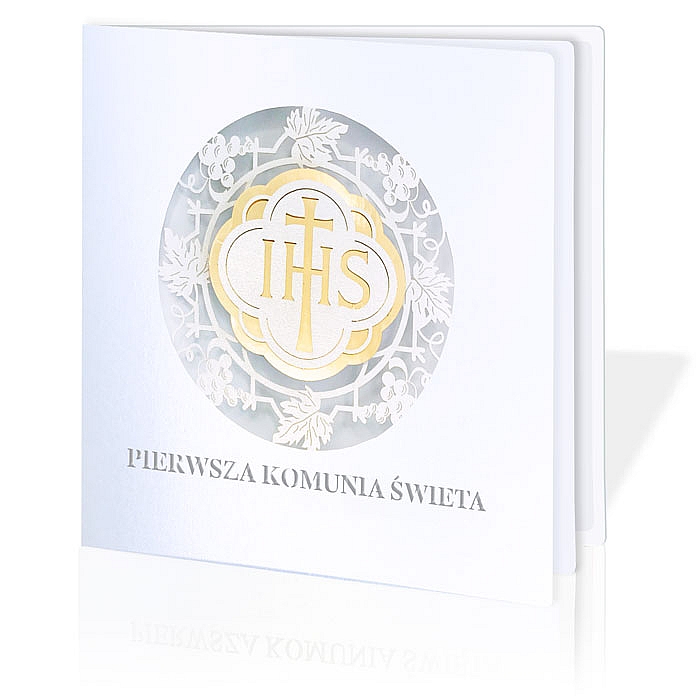 Luksusowe zaproszenie komunijne wykonane z najwyższej jakości metalizowanego papieru w kolorze białym. Okładkę zdobi precyzyjne ażurowe cięcie laserowe oraz elegancka złoto-biała aplikacja, podkreślająca doniosłość uroczystości.
