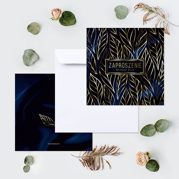 Eleganckie zaproszenie ślubne z limitowanej serii, które zachwyca głębokim granatem i kontrastującym roślinnym wzorem w złotej oprawie graficznej. Front ozdobiony efektem złocenia to nadruk imitujący błysk - bez zastosowania uszlachetnienia, ale z dbałością o wizualny realizm. W środku znajduje się gotowy tekst do ręcznego wypisania, a całość utrzymana jest w luksusowym, wieczorowym stylu.