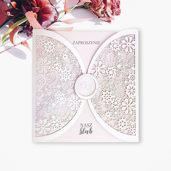 Eleganckie i niezwykle kobiece zaproszenie w odcieniu jasnego różu, wykonane z najwyższej jakości papierów barwionych w masie. Okładka w formie kieszonki została ozdobiona precyzyjnym, ażurowym wycięciem laserowym przedstawiającym kwiatowy wzór, który nadaje zaproszeniu lekkości i subtelnego uroku. Centralny element stanowi lakowy akcent w kolorze pudrowego różu z tłoczonym motywem dwóch serc.