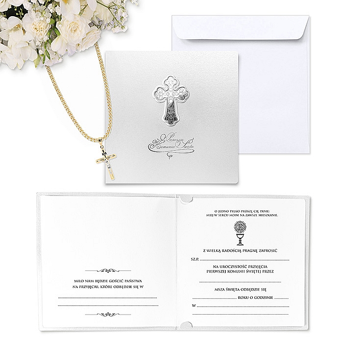 / Zaproszenie komunijne aplikacja srebrny krzyżyk