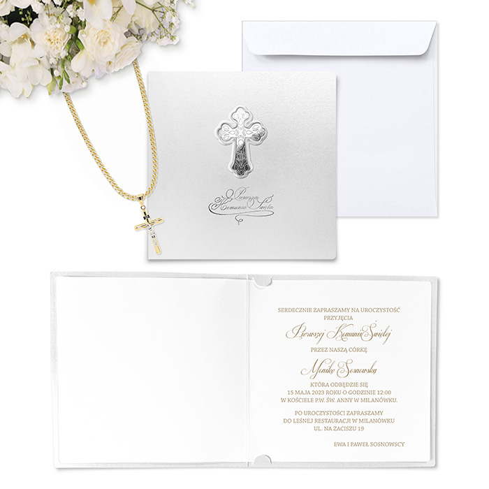 Ekskluzywne zaproszenie wykonane z wysokiej jakości metalizowanego białego papieru, uszlachetnionego prawdziwym srebrzeniem. Oryginalności dodaje misternie grawerowana aplikacja w postaci krzyżyka, wykonana z lustrzanego tworzywa, która pięknie odbija światło i nadaje całości wyjątkowego charakteru.