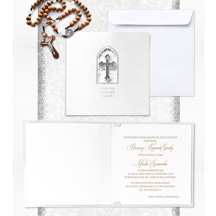 Wyjątkowe zaproszenie wykonane z najwyższej jakości metalizowanego białego papieru, uszlachetnionego prawdziwym srebrzeniem oraz precyzyjnym cięciem laserowym. Ażurowy witraż w centralnej części zaproszenia zdobi grawerowana aplikacja w postaci krzyżyka, wykonana z lustrzanego tworzywa, co nadaje mu elegancji i subtelnego blasku.