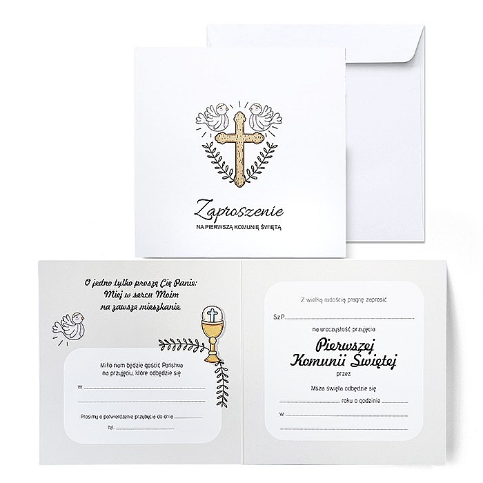 Zaproszenie Komunijne - Na pierwszą Komunie Świętą, wykonane z niepowlekanego, bezdrzewnego papieru klasy premium o z wysokim współczynnikiem białości zapewniający doskonałe krycie i kontrast dla tekstów i grafiki.
