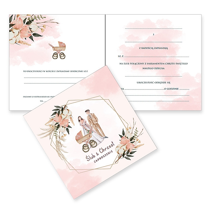 Niezwykle subtelne zaproszenie łączące dwie ważne uroczystości - ślub oraz chrzest dziecka. Utrzymane w pastelowych odcieniach różu i beżu, zachwyca delikatną grafiką przedstawiającą rodziców z wózkiem oraz eleganckimi dekoracjami kwiatowymi. Całość oprawiona została w złotą ramkę geometryczną, tworząc kompozycję spójną i pełną ciepła.