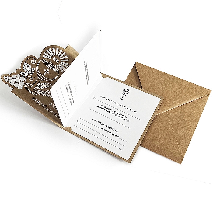 To wyjątkowe zaproszenie łączy naturalne piękno ekologicznego papieru z elegancką precyzją wycięć laserowych, podkreślając uroczysty i podniosły charakter Pierwszej Komunii Świętej.