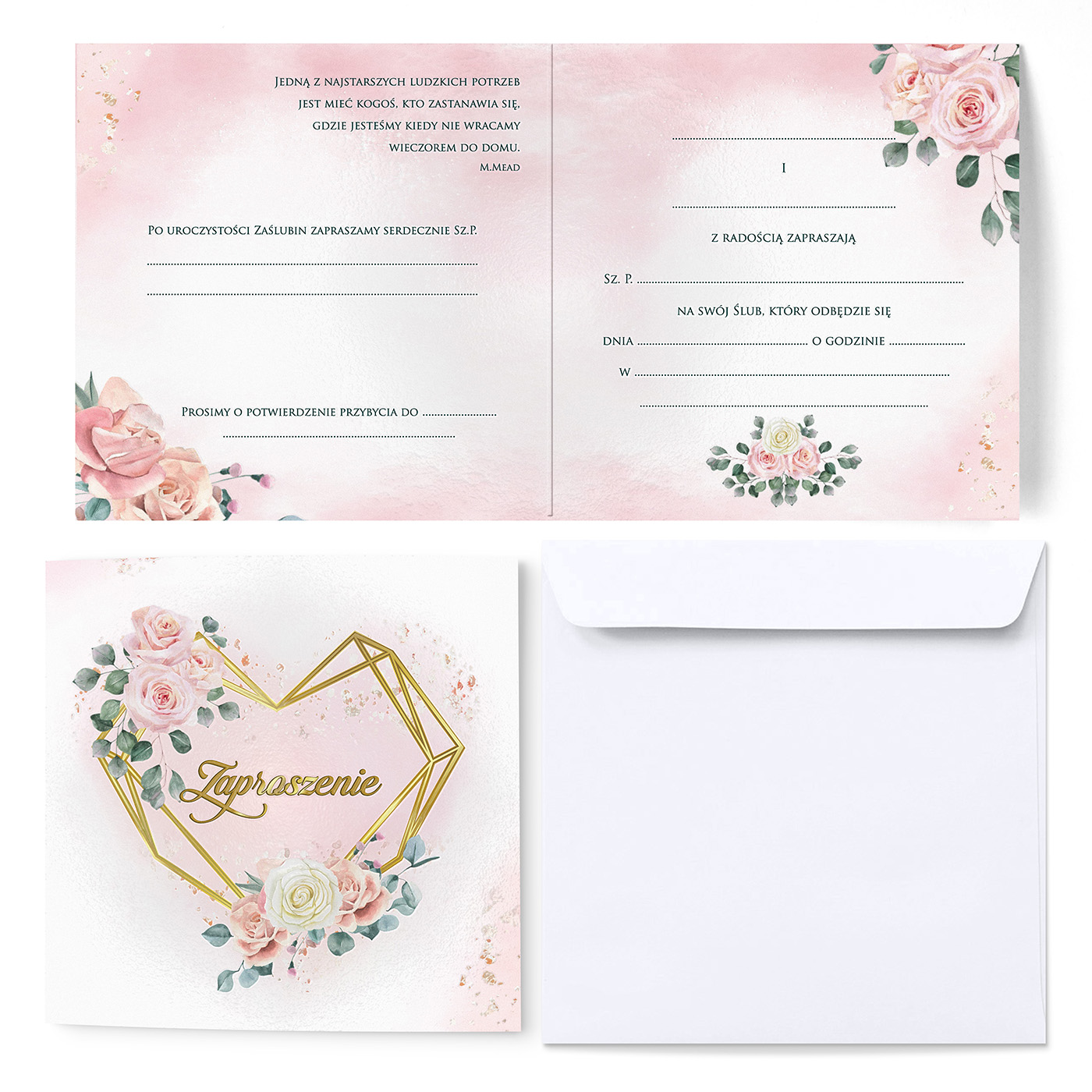 Romantyczne zaproszenie ślubne w subtelnych odcieniach pudrowego różu, ozdobione kwiatowym motywem i geometrycznym sercem w odcieniu złota. Kompozycja łączy delikatność akwareli z nowoczesnym data-stylem graficznym, tworząc projekt, który zachwyca lekkością i elegancją. Front z napisem "Zaproszenie" oraz wnętrze z gotowym tekstem nie wymagają personalizacji - wystarczy ręcznie wpisać dane gości i szczegóły uroczystości.