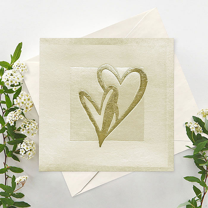 Ekskluzywne zaproszenie ślubne z najnowszej włoskiej kolekcji, stworzone z myślą o parach ceniących niebanalną elegancję i subtelność. Okładka wykonana z delikatnej flizeliny w kolorze ecru ozdobiona została wytłoczonymi i wyzłoconymi sercami na tle perłowego kwadratu. Efekt przestrzenności i połysku sprawia, że zaproszenie prezentuje się wyjątkowo szlachetnie. Wnętrze w klasycznym odcieniu ecru zawiera gotowy tekst do samodzielnego uzupełnienia.
