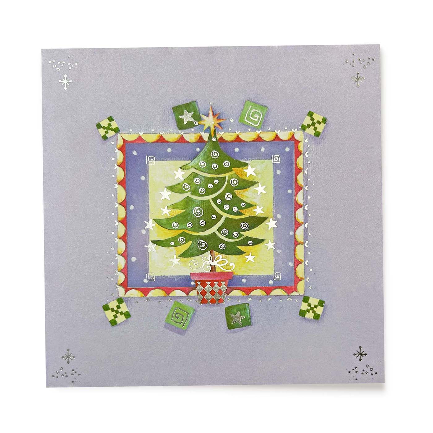Radosna i kolorowa kartka świąteczna z ilustracją stylizowanej choinki, otoczonej dekoracyjną ramką i barwnymi detalami. Utrzymana w pogodnej, pastelowej tonacji, emanuje ciepłem i dziecięcą radością Świąt. Całość dopełnia efektowne srebrzenie gwiazdek i zdobień, nadające kartce eleganckiego blasku.