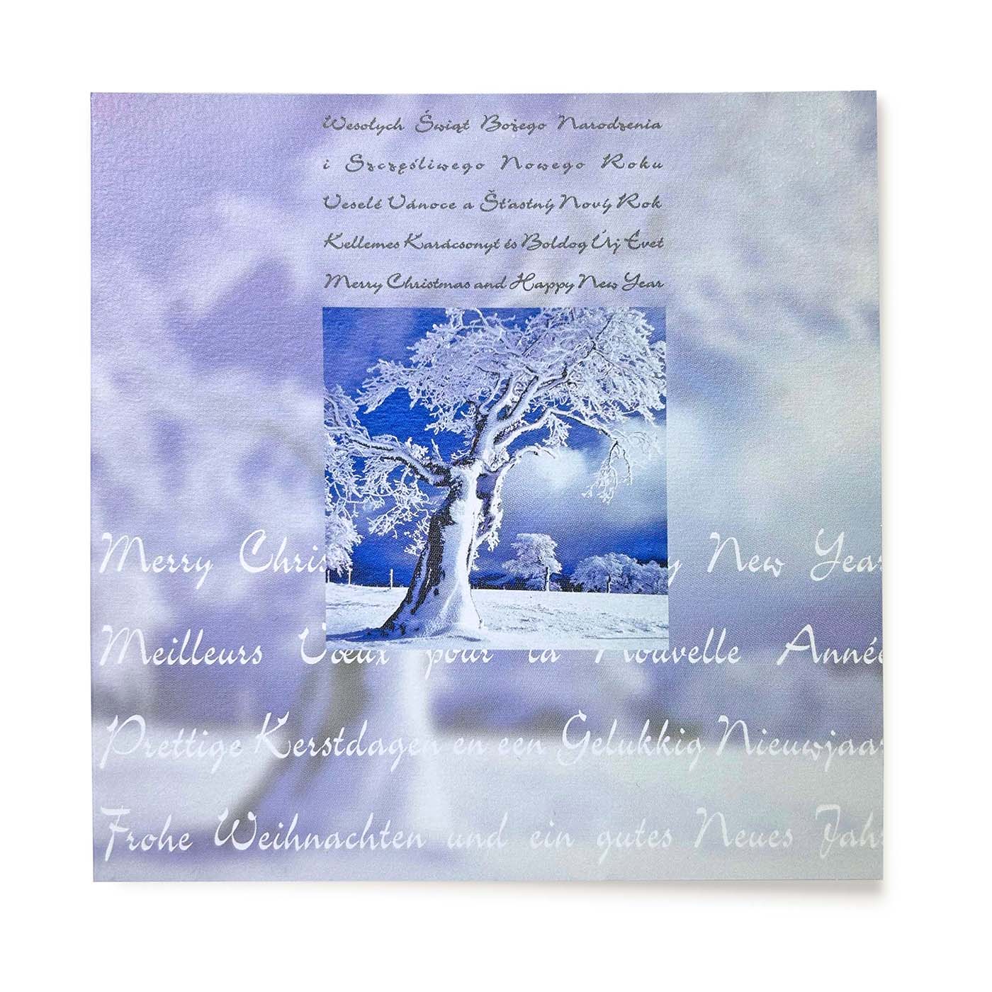 Nowoczesna kartka świąteczna przedstawiająca malownicze, ośnieżone drzewo w zimowej scenerii. Projekt wykonany z najwyższą starannością przy użyciu precyzyjnego druku cyfrowego. Tło okładki ozdobione jest subtelnym nadrukiem życzeń w wielu językach, co nadaje całości eleganckiego, międzynarodowego charakteru. Idealna propozycja dla firm oraz osób ceniących estetykę i profesjonalne wykonanie.
