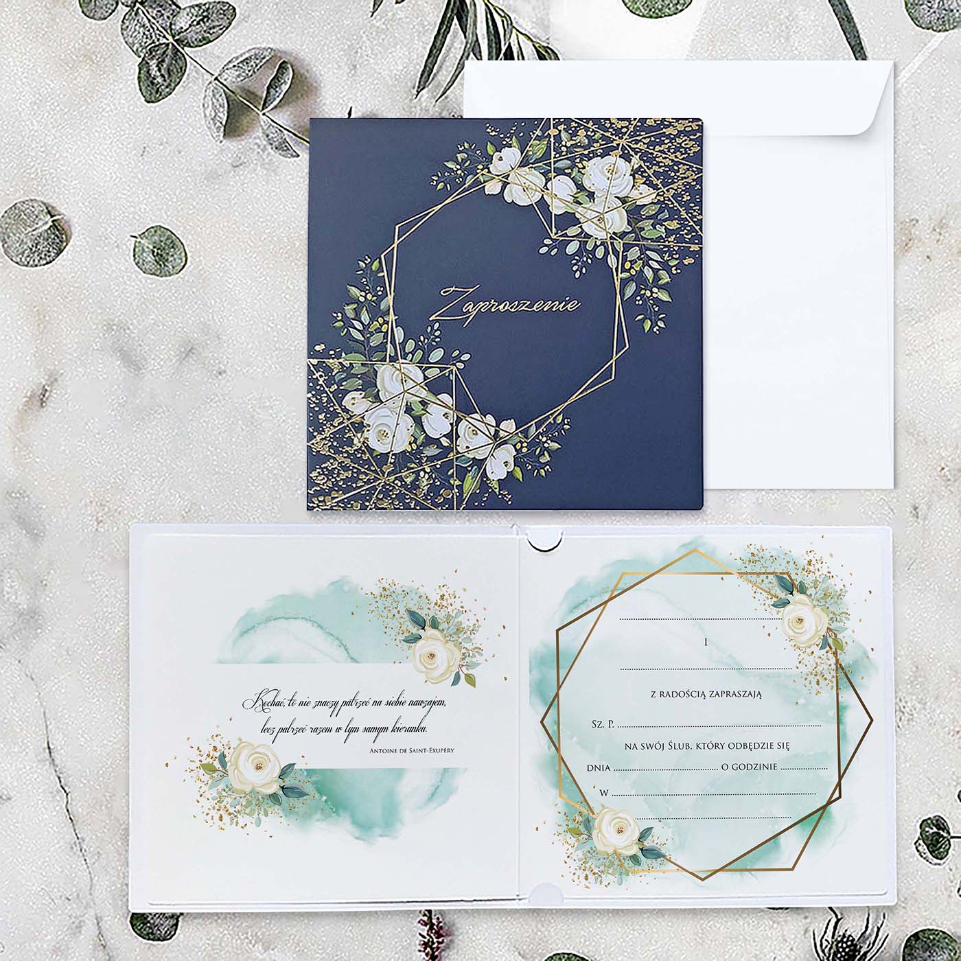 Ekskluzywne zaproszenie ślubne, które zachwyca elegancją i precyzją wykonania. Okładka w głębokim granacie pokryta jest satynową, aksamitną folią, dzięki czemu całość jest przyjemna w dotyku i zyskuje luksusowy charakter. Florystyczny motyw białych róż oraz geometryczny wzór ozdobiony zostały prawdziwym złoceniem i lakierem wybiórczym, tworząc efektowną kompozycję z wyczuwalną strukturą.