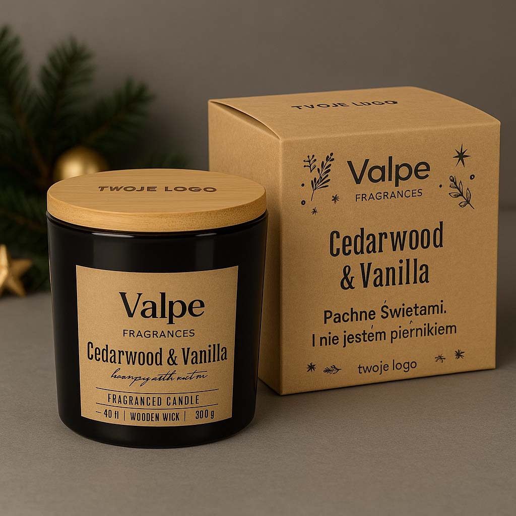 Świeca dostępna w wersji standardowej - dokładnie jak na stronie, lub w eleganckim pudełku z Twoim logo i grafiką.