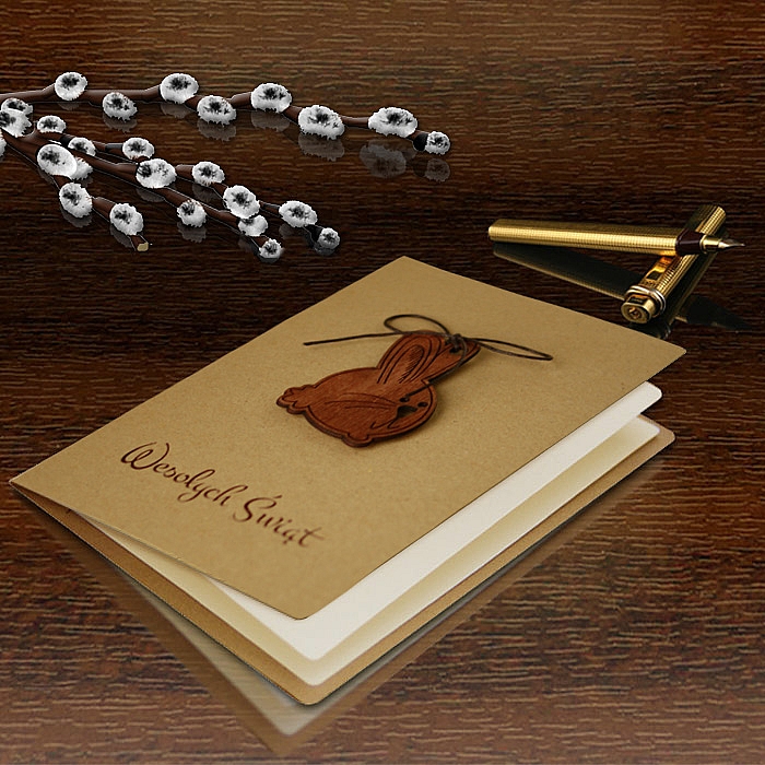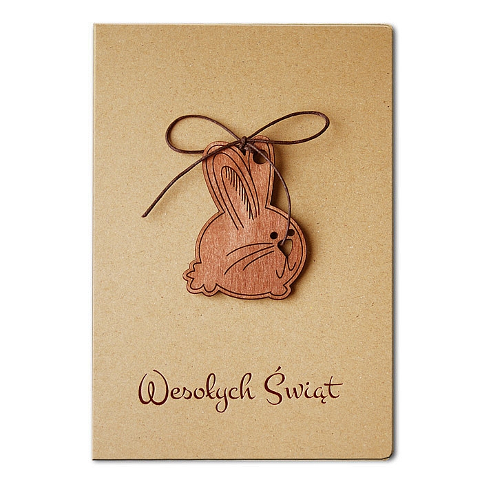 Kartki wykonane są na papierze w naturalnym odcieniu, który idealnie komponuje się z drewnianą aplikacją w kształcie wielkanocnego zajączka. Aplikacja została precyzyjnie wycięta i przewiązana naturalnym sznurkiem, co nadaje całości autentyczny, ekologiczny charakter i subtelną dekoracyjność bez zbędnych ozdobników.