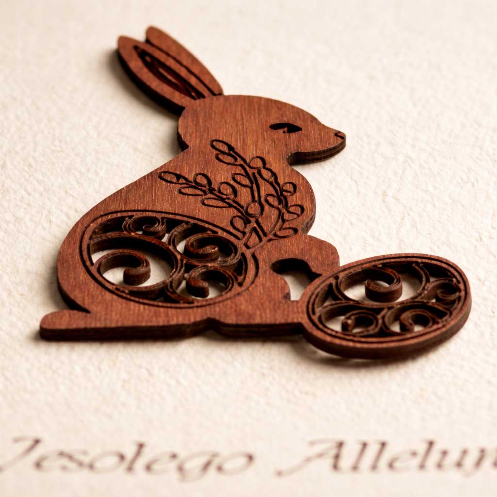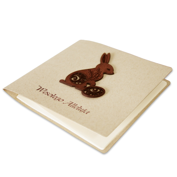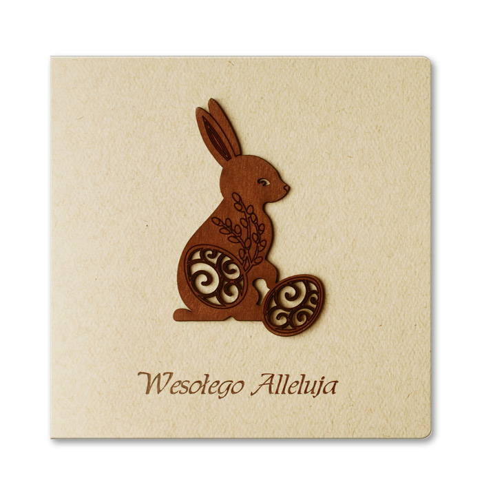 Okładka kartki utrzymana jest w jasnej, naturalnej kolorystyce, która doskonale podkreśla drewnianą aplikację w kształcie wielkanocnego zajączka. Dekoracja została wykonana z precyzyjnie wycinanego drewna, z delikatnymi ażurowymi detalami, nadającymi całości lekkości i rzemieślniczego charakteru. To ozdoba, która robi wrażenie, a jednocześnie pozostaje stonowana i elegancka.