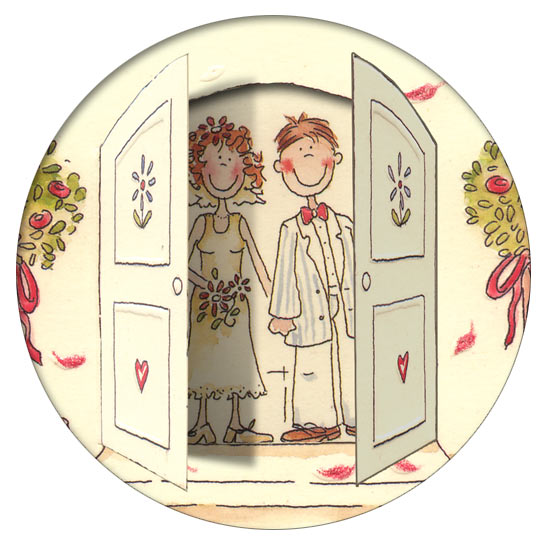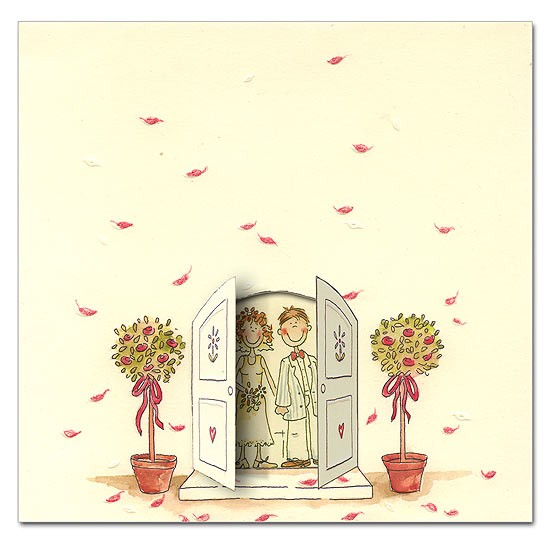 Zaproszenie wykonane z gładkiego papieru. Okładka ozdobiona jest tłoczonymi listami spadającymi na wycięte okno, poprzez które widoczna jest nadrukowana Para trzymająca się za ręce. Po obu stronach okna kwiaty w doniczkach. W środku wykonana jest kieszonka z nadrukowaną Parą. W kieszonkę wsuwamy jest kwadrat z tekstem zaproszenia ozdobiony szlaczkiem z liści.