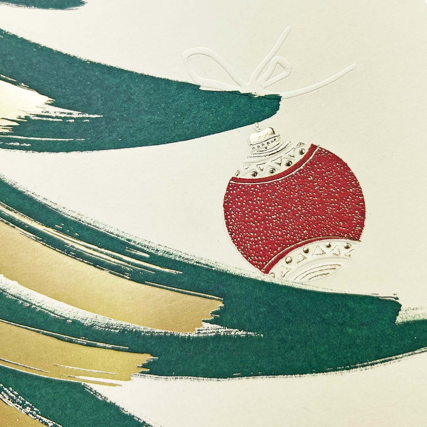 Nowoczesna kartka świąteczna, która łączy artystyczny gest z elegancją świątecznych symboli. Kompozycję tworzy dynamiczny zarys choinki, namalowany zielonymi pociągnięciami pędzla i uzupełniony złoconymi akcentami. Centralnym elementem jest wypukła, subtelnie złocona bombka z czerwonym połyskiem, która przyciąga wzrok i wprowadza świąteczny nastrój.