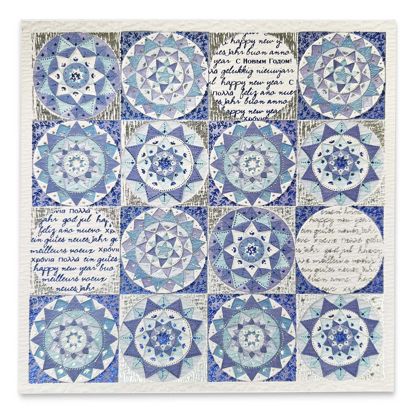Ekskluzywna karta świąteczna zaprojektowana przez najlepszych projektantów z Barcelony! Zjawiskowa okładka wykonana z białego, fakturowanego papieru, bogato zdobiona misternymi wzorami przypominającymi mandale i śnieżynki. Kuliste elementy zostały poddane uszlachetnieniu techniką tłoczenia oraz srebrzenia folią niebieską i srebrną, co tworzy niezwykły, trójwymiarowy efekt. W trzech miejscach - niczym w bańkach świątecznych - widoczne są fragmenty życzeń świątecznych w różnych językach.