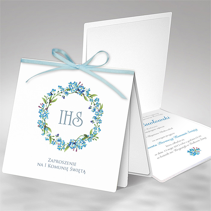 Wyjątkowe zaproszenie komunijne wykonane z matowego, wysokiej jakości białego papieru. Na okładce znajduje się subtelna, kolorowa ilustracja przedstawiająca delikatny wianek z niezapominajek, który symbolizuje niewinność i czystość tego wyjątkowego dnia.