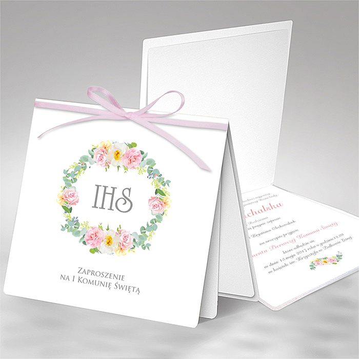 Wyjątkowe zaproszenie na Pierwszą Komunię Świętą, wykonane z wysokiej jakości matowego papieru w kolorze białym. Na okładce znajduje się kolorowa ilustracja przedstawiająca komunijny wianek, symbolizujący czystość i duchowe znaczenie uroczystości.