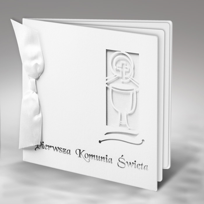 Zaproszenie na Pierwszą Komunię Świętą, wykonane z wysokiej jakości metalizowanego papieru w kolorze białym, który nadaje mu subtelny, elegancki połysk.