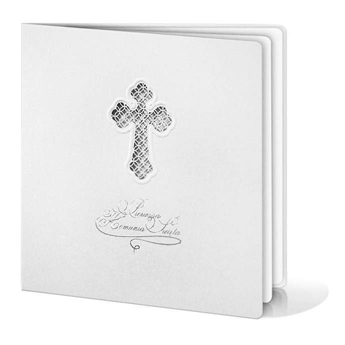 Na okładce znajduje się precyzyjnie wycięty laserowo krzyż, którego brzegi zostały delikatnie wytłoczone, nadając mu wyjątkowy charakter. Poniżej krzyża umieszczony jest wysrebrzony napis ?Pierwsza Komunia Święta?, który dodaje elegancji i podkreśla doniosłość uroczystości.