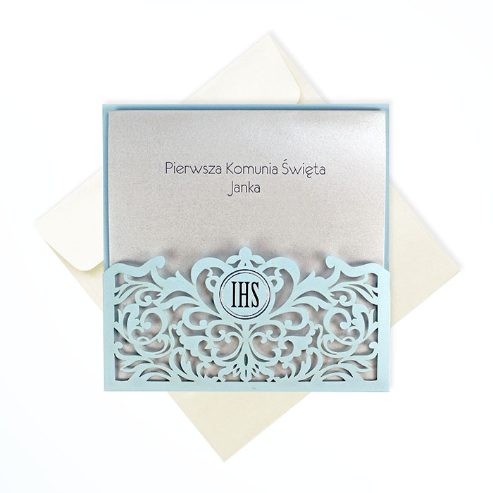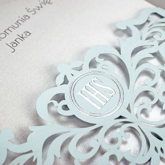 Eleganckie zaproszenie na Pierwszą Komunię Świętą, wykonane z wysokiej jakości papieru z subtelnym efektem srebrzenia. Okładka zdobiona precyzyjnym wycięciem laserowym, tworzy delikatny, ażurowy wzór, nadając całości wyjątkowego charakteru. Wkładka do nadruku w odcieniu lodowej bieli o perłowym wykończeniu doskonale współgra z eleganckim data-stylem zaproszenia.