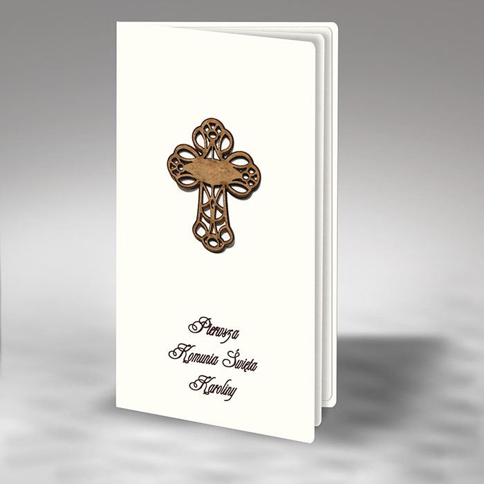 Na okładce znajduje się drewniana aplikacja w postaci krzyża, dodająca naturalnego uroku i podkreślająca duchowy wymiar uroczystości. Poniżej umieszczony został nadrukowany napis "Pierwsza Komunia Święta", dopełniający kompozycję w klasycznym i stylowym wydaniu.