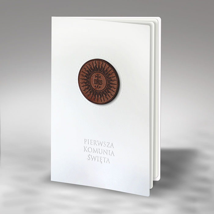 Na okładce umieszczona została drewniana aplikacja z literami "IHS", podkreślająca sakralny charakter uroczystości. Poniżej aplikacji wytłoczony napis "Pierwsza Komunia Święta", dodający zaproszeniu wyjątkowego szyku i uroku.