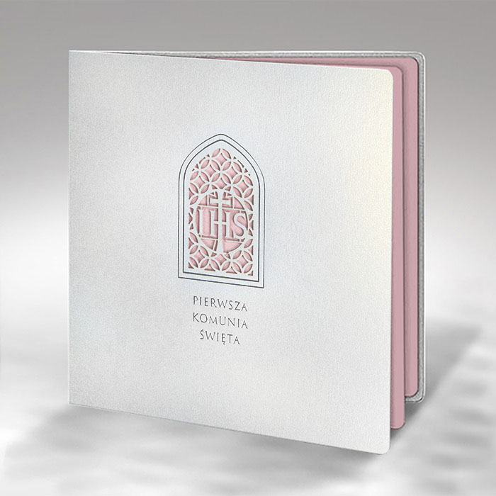 Na okładce umieszczono misternie wycięty laserowo motyw w formie okna witrażowego z symbolem IHS, który podkreśla sakralny i uroczysty charakter wydarzenia. Wycinany wzór ukazuje różową wkładkę, tworząc efekt głębi i elegancji. Minimalistyczny nadruk dopełnia całości, czyniąc projekt stylowym i ponadczasowym.
