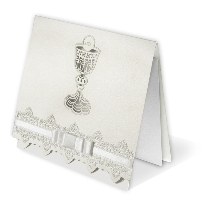 Na okładce znajduje się wycięty laserowo kielich z hostią, którego kontury dodatkowo wytłoczono, podkreślając jego wyjątkowy charakter. Dolna część okładki ozdobiona jest tłoczonym motywem kwiatowym oraz białą, atłasową wstążką, co nadaje zaproszeniu subtelnej i uroczystej oprawy.