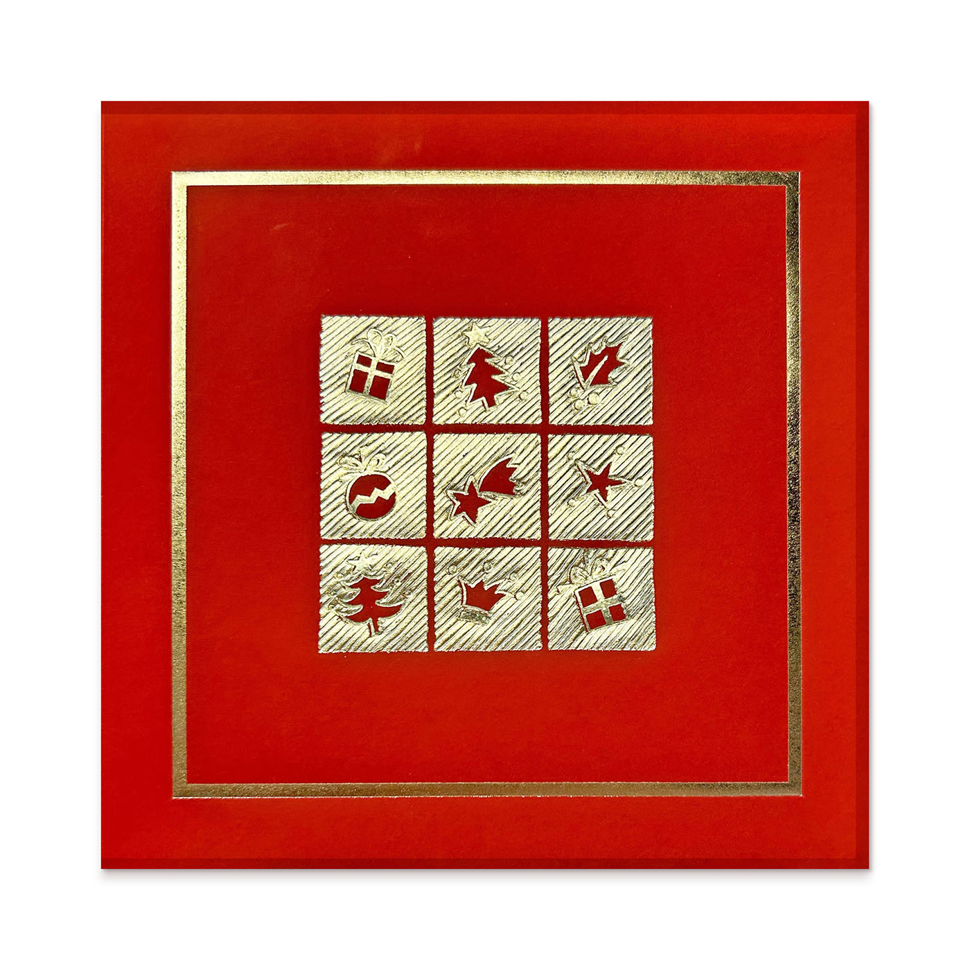 Ekskluzywna kartka świąteczna wykonana z czerwonej kalki ozdobnej, uszlachetnionej złoceniem. W centralnej części kompozycji znajduje się klasyczny układ świątecznych ikon - prezentów, choinek, gwiazd i bombek - w formie tłoczonych złotych piktogramów. Złota ramka podkreśla wyjątkowy, elegancki charakter kartki. Wkładka do nadruku wykonana ze sztywnego, matowego papieru o delikatnej fakturze, idealnie kontrastuje z połyskującą okładką.
