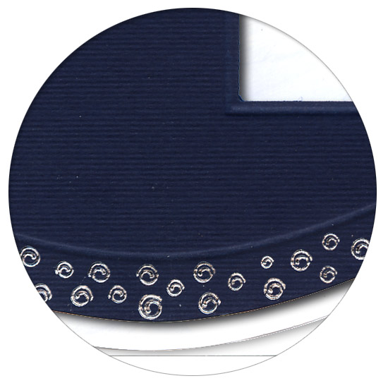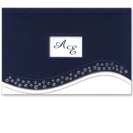 Okładka wykonana z granatowego papieru z regularną fakturą. Dół ozdobiony falką ze srebrnym nadrukiem. Dookoła wytłoczony prosty pasek. W środkowej części wycięty prostokąt, możliwość nadrukowana np. imion Pary Młodej lub daty ślubu.