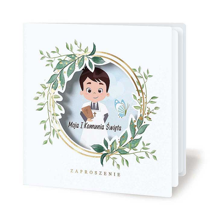 To ekskluzywne zaproszenie komunijne dla chłopca wyróżnia się klasycznym wzornictwem i elegancją, tworząc piękną pamiątkę tego wyjątkowego dnia.