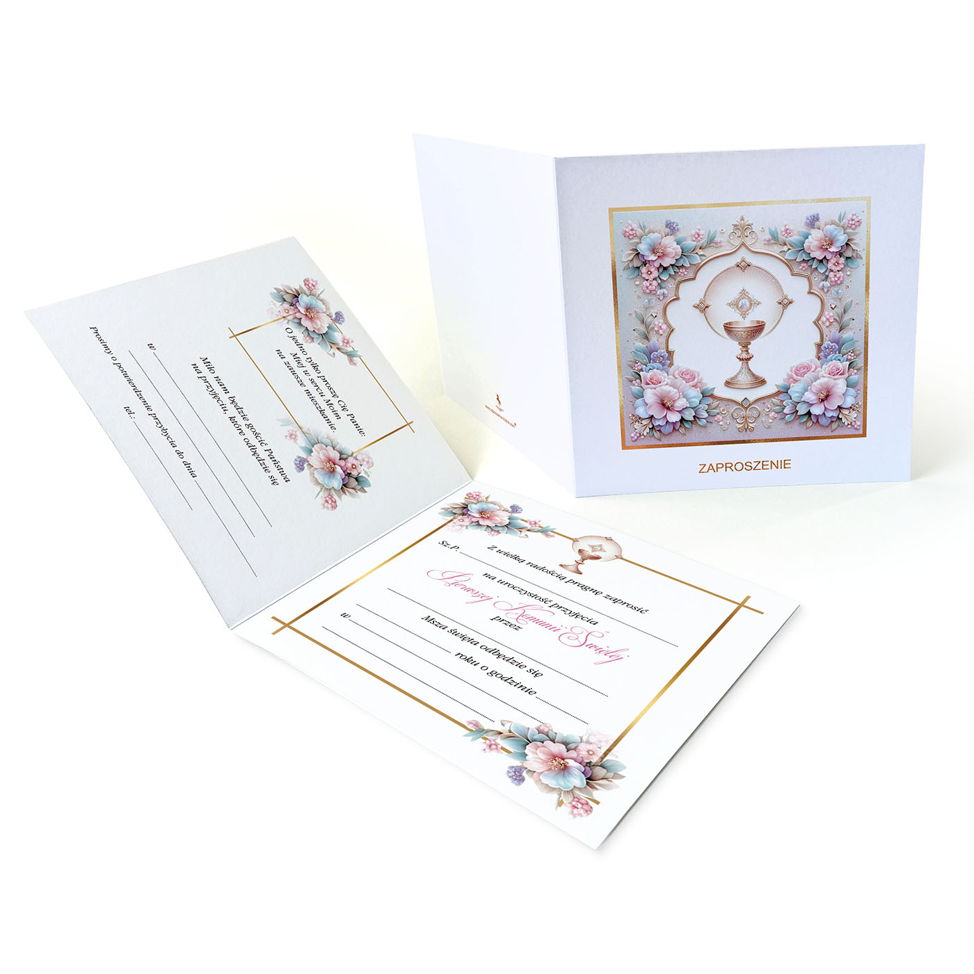 Zaproszenie na pierwszą Komunię Świętą, wykonane z niepowlekanego, bezdrzewnego papieru klasy premium o z wysokim współczynnikiem białości zapewniający doskonałe krycie i kontrast dla tekstów i grafiki.
