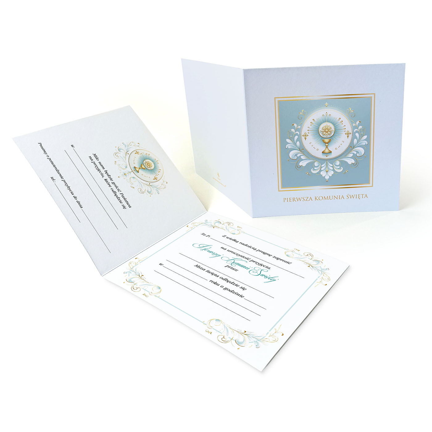 Zaproszenie na pierwszą Komunię Świętą, wykonane z niepowlekanego, bezdrzewnego papieru klasy premium o z wysokim współczynnikiem białości zapewniający doskonałe krycie i kontrast dla tekstów i grafiki.