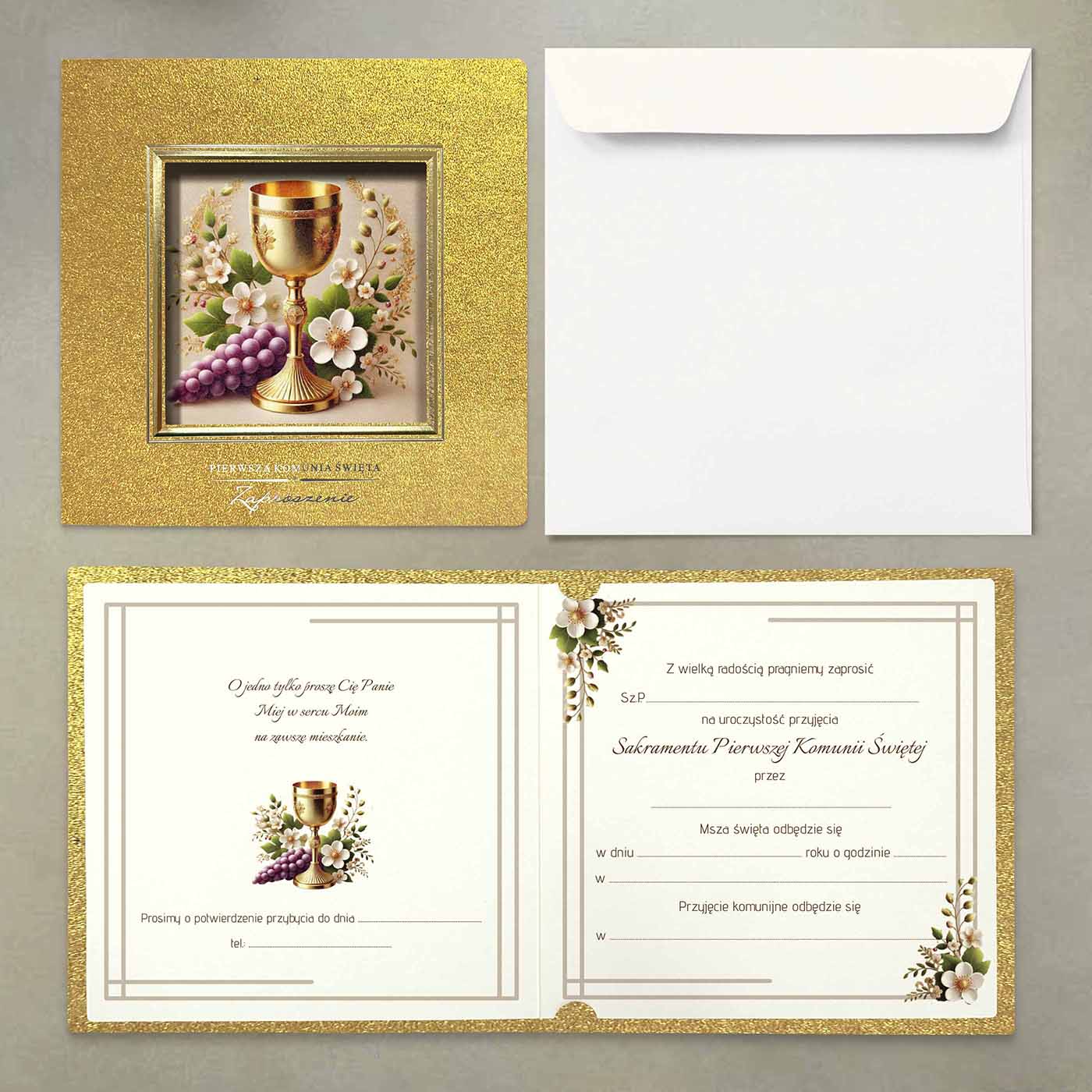 Ekskluzywne zaproszenie na Pierwszą Komunię Świętą, wykonane z wysokiej jakości metalizowanego papieru w kolorze złotym. Stworzone z dbałością o każdy detal, aby podkreślić uroczysty i wyjątkowy charakter tego dnia.